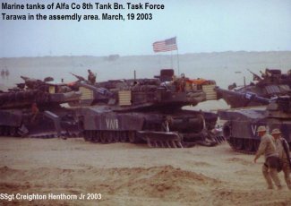 From the get go our mission was going to be to take the bridges in Nasiriyah to clear the route north for the 1st Marine Expeditionary Force (MEF) from California. On March 20th we left our base camp in Kuwait and headed north to our assembly area. That night 1 MEF crossed the breach into Iraq and we followed the next morning. We headed north to Jalibah Airfield and on the night of the 22nd we set into a defensive position north of the airfield. Early in the morning of the 23rd we packed up and headed for Nasiriyah.