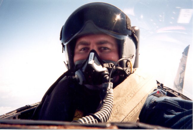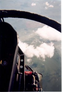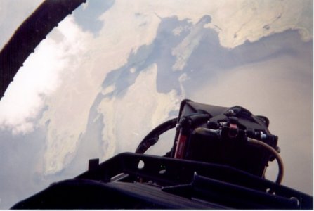 After about 40 minutes of BFM, ‘bingo’ was called. We set up the standard ‘battle damage check’ and then started back for the Base. Our 2 ship performed a nice formation into the break over the Base. On final my pilot realized we had a bit of extra fuel we could burn. Performing a ‘touch-an-go’, we took-off again. Once wheels and flaps were up, the pilot skimmed the earth to the end of the runway limits. He then pulled into a nice 4.5 g vertical and cranked us off to the right. We went around and did another touch-an-go. This time we headed off a bit further. We flew about 4 or 5 miles away from the Base. The pilot then gave me control of the jet. He instructed me to put in full afterburner and execute a 4 g right hand turn. After lighting the burners, I pulled to the right and pulled back on the stick. I was at about 2 g’s when the pilot came back on the radio and said “Come on ya pussy, pull 4 g’s!!” So at that, I pulled the stick much harder. After executing a 5.5 g turn and rolling back out into straight flight the pilot took control back. The next radio call was, “Good job, you pulled 5.5 g’s instead of 4 g’s….I guess calling you a pussy was enough to egg you on!!”